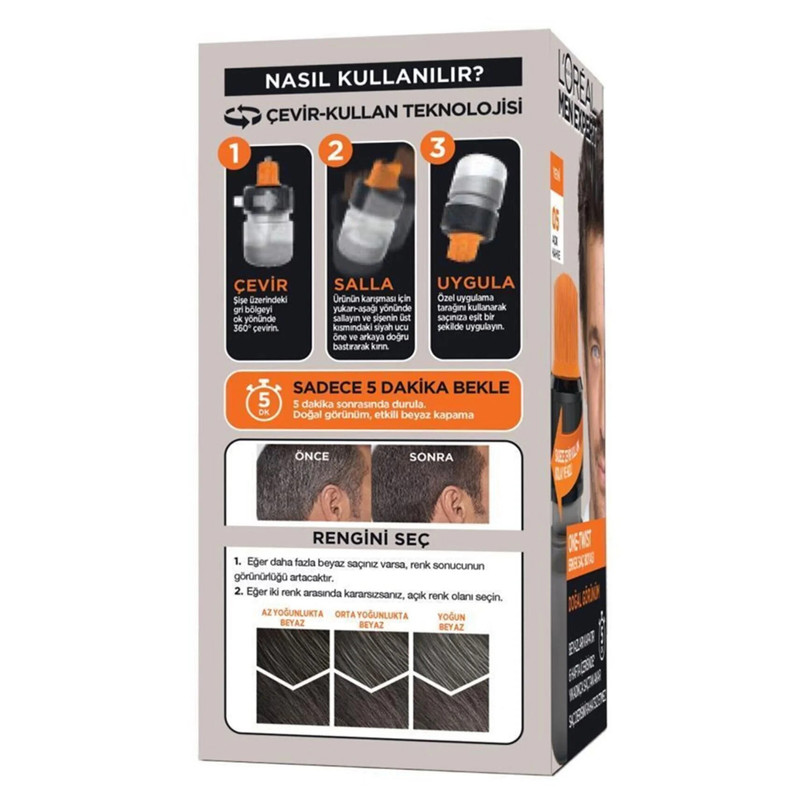رنگ موی مردانه لورآل محصولی تخصصی برای پوشاندن سفیدی موها.با فرمولاسیون ویژه ای که لین محصول دارد، رنگی مطابق با رنگ موی شما را در نهایت باقی میگذارد . به لطف نتیجه رنگ طبیعی، هیچ کس متوجه نخواهد شد که موهای خود را رنگ کرده اید. علاوه بر این، زمان انتظار تنها 5 دقیقه است! حاوی آمونیاک نیست و پوست سر را تحریک نمی کند. داخل بسته بندی یک ژل تست حساسیت وجود دارد که میبایست 48ساعت قبل از مصرف آنرا در پشت گوش برای مطمئن شدن از عدم حساسیت استفاده کنید.