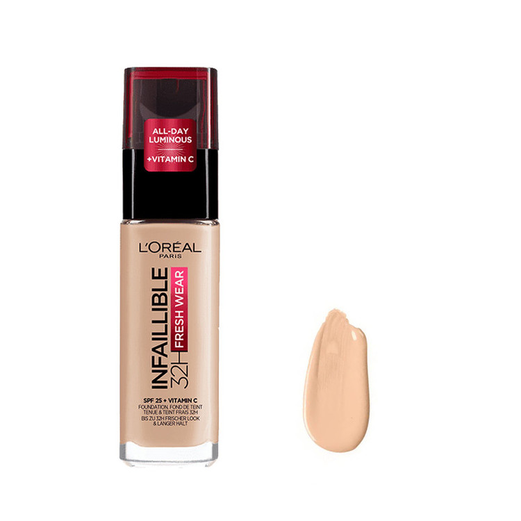 کرم پودر Infallible لورآل، با پوشش و ماندگاری 32 ساعته، رنگ پوست را یکنواخت می کند. این کرم پودر دارای SPF25 و ویتامین C است که از پوست در برابر اثرات مخرب نور خورشید محافظت می کند. کرم پودر لورآل ضد حساسیت است و رطوبت و تعریق در پوشش آن تغییری ایجاد نمیکند.