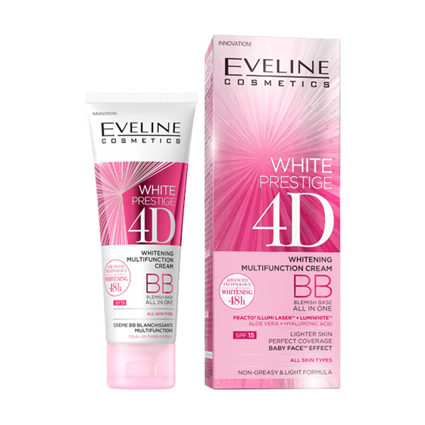 بی بی کرم روشن کننده صورت اولاین وایت پرستیژ Eveline White Prestige BB پوشش دهنده کامل و دارای فناوری الهام گرفته از لیزر درمانی جهت افزایش روشنایی پوست در چهار بعد شامل: روشن کنندگی پوست، افزایش شفافیت پوست، جلوگیری از ایجاد لک و بهبود شرایط کلی پوست می باشد. بی بی کرم روشن کننده وایت پرستیژ حاوی فناوری FRACTO2 ILLUMI LASER عمل کننده حرفه ای مانند لیزر درمانی به همراه کمپلکس Lumiwhite جهت روشن کنندگی، هموار کنندگی و کاهش لک پوست است. علاوه بر این هیالورونیک اسید جهت آبرسانی قوی و آلوئه ورا جهت شادابی، تسکین و حفظ رطوبت پوست به این ترکیب اضافه شده است.برای استفاده کرم را بر روی پوست تمیز صورت ماساژ دهید. کرم بی بی اولاین قابل استفاده به صورت کرم مراقبتی، پایه آرایش یا کرم پودر سبک می باشد.