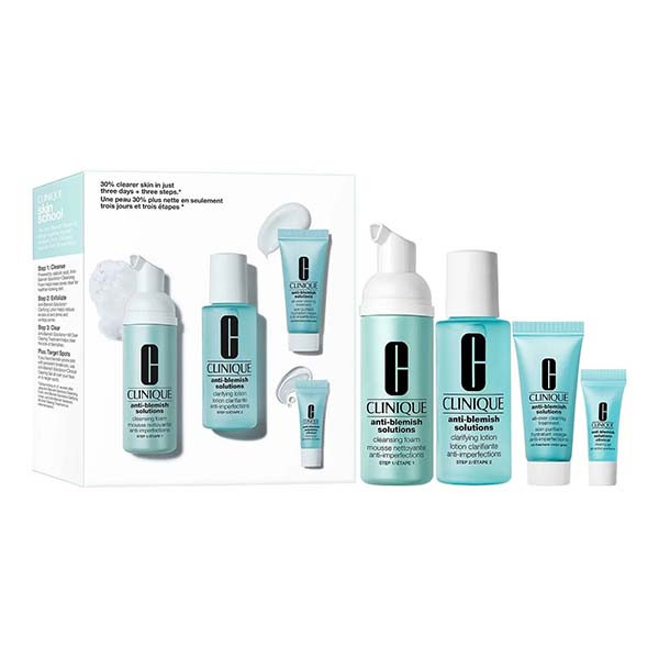پک مراقبت پوستی کلینیک مدل Anti-Blemish Solutions مجموعه ای از محصولات پرطرفدار برند کلینیک مناسب برای پوستهای لک دار و جوش دار است که شامل فوم شستشوی صورت Anti-Blemish Solutions (حجم 50 میلی لیتر ) با استفاده از این فوم شستشو تمام آلودگیها، نا خالصی ها و چربی اضافی روی پوستتان از بین می رود در نتیجه منافذ شما کاملاً تمیز خواهد شد. علاوه بر این فوم کلینیک قرمزی و التهاب روی پوست را نیز به حداقل می رساند و اندازه منافد باز پوست را کم می کند.در ترکیبات این فوم از سالیسیلیک اسید و استیل گلوکوزامین استفاده شده است. این دو ماده خاصیت ضد عفونی کنندگی فوق العاده ای دارند و سلول های مرده پوست را از بین می برند. عصاره های گیاهی مختلفی در ترکیبات این فوم یافت می شود که قرمزی و التهاب پوست را تسکین می بخشند. با استفاده از این فوم ضد جوش به مرور زمان پوستی صاف، شاداب و تمیز خواهید داشت.دومین محصول تونر کلینیک Clarifying Lotion (حجم 60 میلی لیتر) این محصول از برند کلینیک یک لوسیون تونر ضدجوش و شفاف کننده است. یک محصول درمانی موثر که برای پوستهای مستعد آکنه تولید شده و میتواند یک روتین ضد جوش موثر را تکمیل کند. فرمولاسیون آن پوست را لایهبرداری و پاکسازی کرده و چربی اضافی را که میتواند باعث ایجاد جوش صورت شود، کاهش میدهد.تونر آنتی بلمیش کلینیک یک لوسیون لایهبردار و مات کننده است که باید در دومین یا سومین مرحله روتین پوست، بعد از پاک کردن آرایش و شستشوی پوست استفاده شود. این محصول منافذ مسدود شده با سبوم و سلولهای مرده را پاکسازی میکند. با رفع گرفتگی و تصفیهی منافذ، احتمال رشد باکتریهای مولد جوش و ایجاد انواع آکنه بسیار کمتر میشود.کرم آبرسان کلینیک مدل All Over Clearing (با حجم 15 میلی لیتر) کرم آبرسان ضد جوش کلینیک در کنار خاصیت آبرسانی و مرطوب کنندگی، از ایجاد جوش و لکههای روی پوست جلوگیری کرده و به پوستهای چرب کمک میکند زیباتر و سالمتر دیده شوند. و آخرین محصول این مجموعه ژل شستشوی صورت کلینیک مدل Clearing Gel این ژل شستشوی صورت را برای شستشوی روزانه پوستهای چرب و مستعد جوش طراحی کرده است. ژل شوینده آنتی بلمیش(با حجم 3 میلی لیتر) بافتی سبک دارد که در تماس با آب میتواند یک فوم پاکسازیکننده موثر درست کند. این فوم تمامی سبوم اضافی، آلودگیها را از بین میبرد.