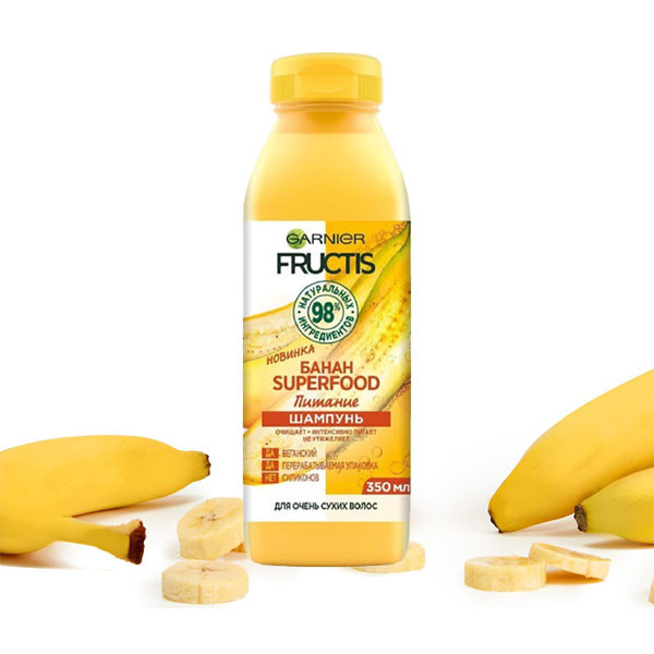 شامپو مغذی موز گارنیه Garnier Nourishing Banana دارای فرمول غنی و حاوی 98 درصد عصاره های طبیعی جهت تغذیه قوی و سریع و رفع خشکی موها می باشد. شامپو مغذی گارنیه حاوی عصاره موز با خواص تغذیه کنندگی و نرم کنندگی بوده و به سرعت موها را منظم و قابل مدیریت می کند، علاوه بر این حاوی روغن نارگیل جهت احیای سلامتی، رساندن مواد مغذی مورد نیاز فیبر مو و افزایش انعطاف پذیری آن می باشد.