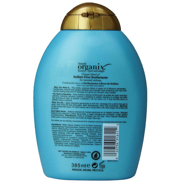 شامپو ترمیم کننده روغن آرگان او جی ایکس، حاوی ترکیبی منحصر به فرد و با ارزش از روغن آرگان مراکش است که با نفوذ سریع به بافت مو آنها را بهبود می بخشد و همچنین سبب درخشش و نرمی مو میگردد. در حالی که با کمک به تقویت و ایجاد نرمی در موها سبب ابریشمی شدن آنها میشود. این شامپو حاوی روغن آرگان و روغن هسته های درخت آجران مدیترانه ای می باشد و حاوی مقادیر بالایی از آنتی اکسیدان ها و ویتامین E برای صاف کردن و محافظت از مو است. این فرمولاسیون سبب میشود مواد به عمق مو نفوذ کند و آبرسانی از درون انجام شود و موها صاف و ابریشمی گردد. این شامپو از برند ارگانیکس مناسب برای انواع مو می باشد
